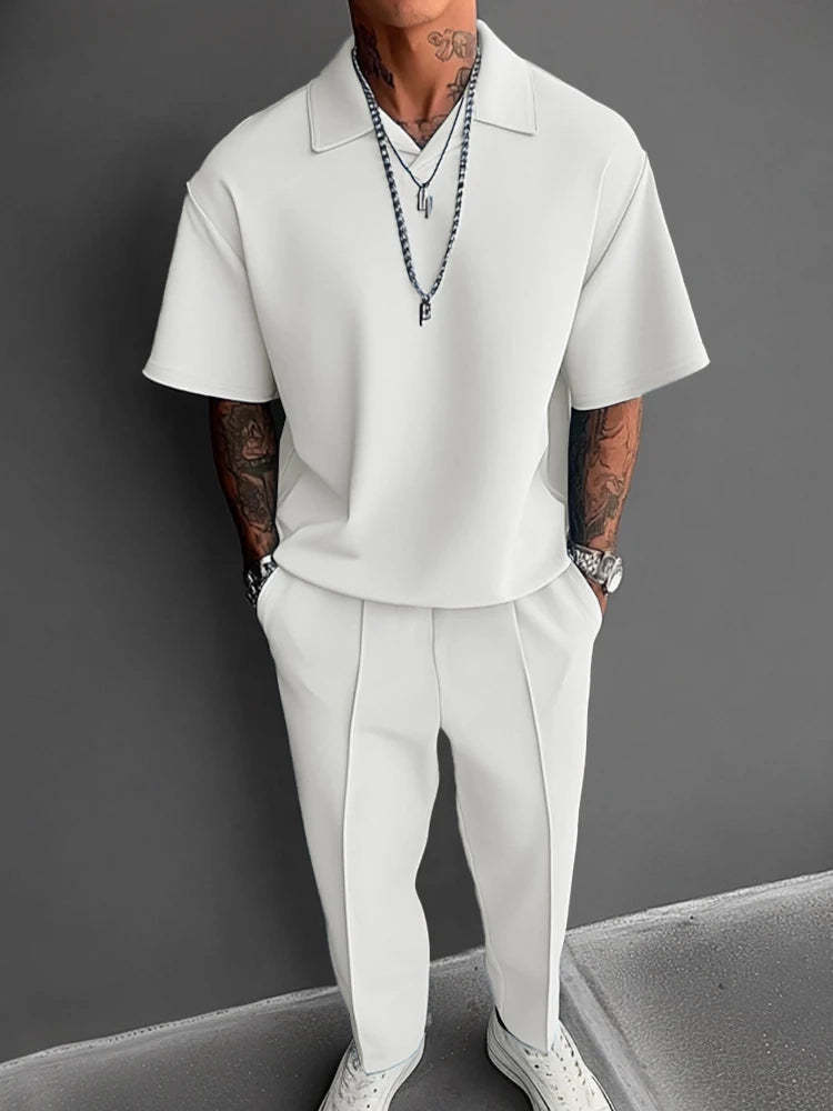 The Easy Summer Fashion Set brings together thoughtful tailoring and practical comfort in a streamlined design that works well in summer’s warmth. With a Short Sleeve Polo Set top and Pleated Trousers Set for Men, this outfit forms a cohesive look that can transition between settings with ease.