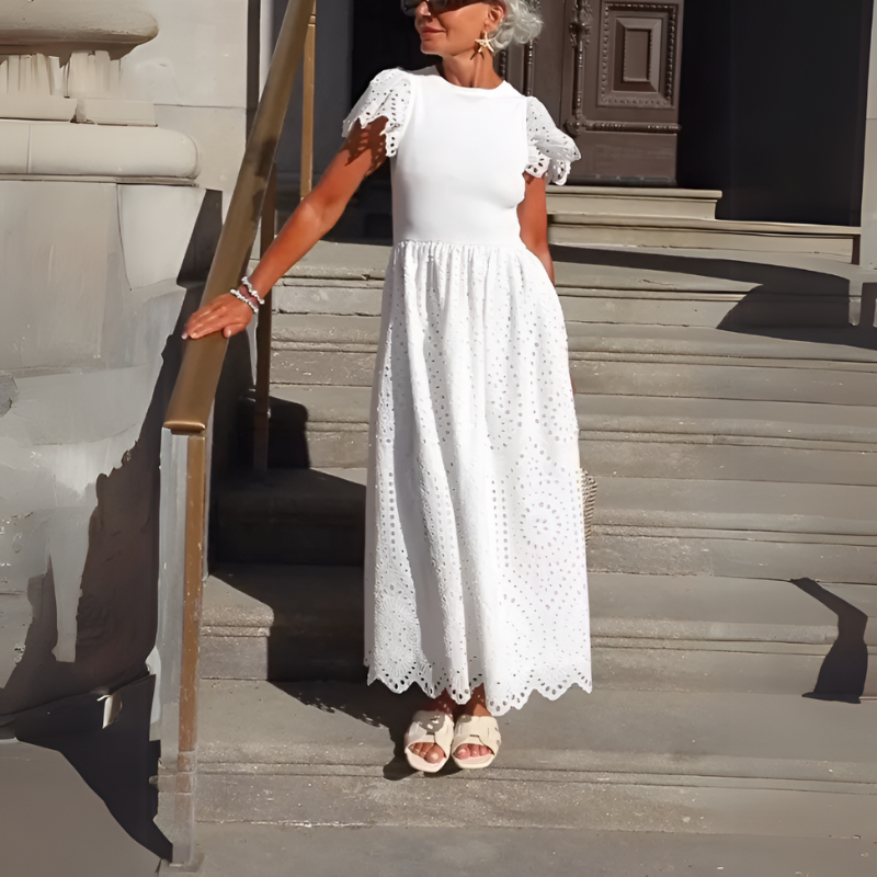 - The Eyelet Maxi Dress with flutter sleeves and a scalloped hem is a reliable choice for elegant seasonal styling. It blends softness and structure in one refined silhouette.