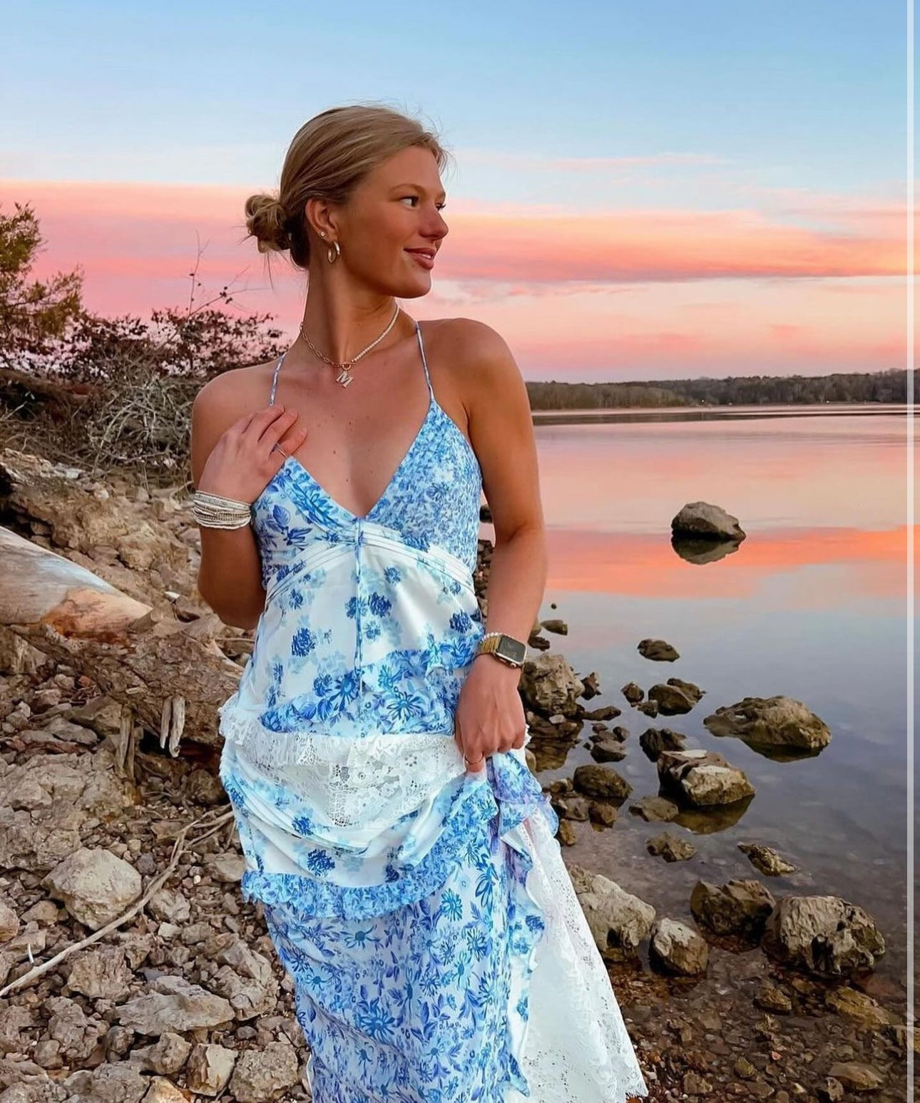 Design: Mixed print paneling and floral lace with ruffle details for a vintage-inspired look.