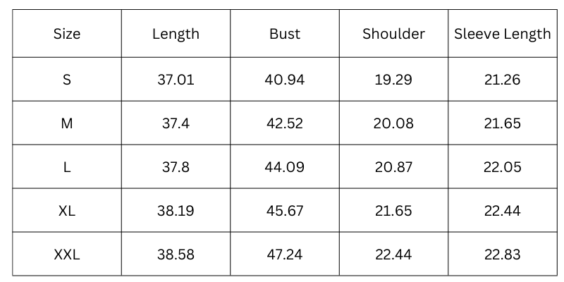 Size Chart (inches):